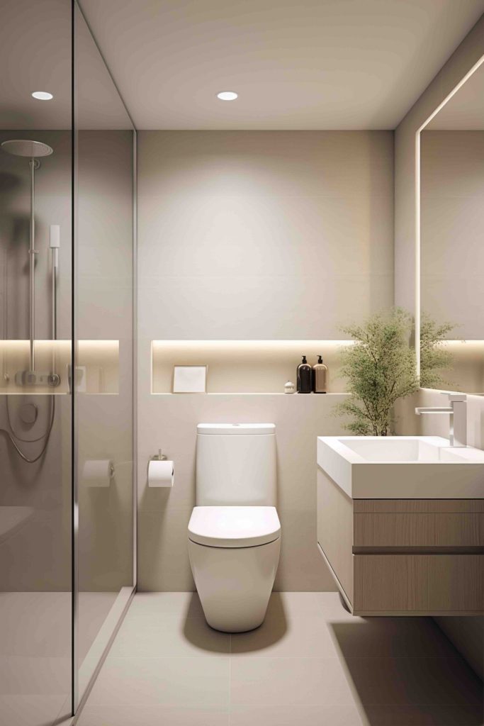 Además, las líneas limpias y rectas son fundamentales en el diseño minimalista. Los muebles y accesorios de baño deben ser sencillos, sin ornamentos innecesarios. Esta simplicidad ayuda a crear un espacio ordenado y funcional, donde cada elemento tenga su lugar asignado.